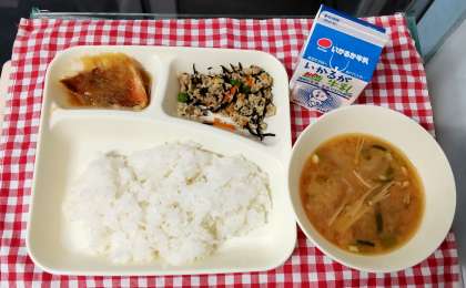 今日は、赤魚のおろしじょうゆかけ、みそ汁、高野豆腐の炒り煮、ご飯、牛乳でした。骨が少ない赤魚は食べやすく魚が苦手な子にも好評でした。