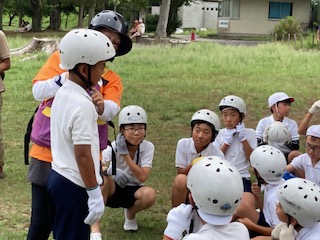 ヘルメットの被り方を教えてもらっています。