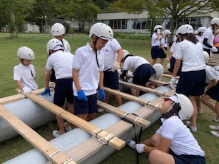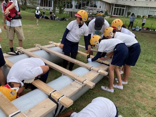 筏の下にフロートを置いて、またベルトで締めていきます。
