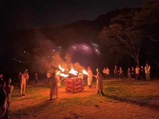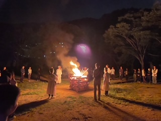 キャンプファイヤーを19時から始めました。火の子達が火の神から火をもらい点火しました。