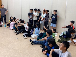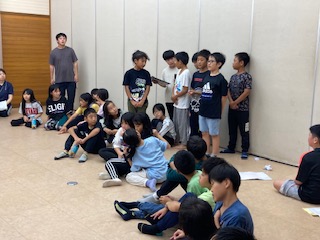 多目的室でのキャンプファイヤーゲームが終わりました。雨の中のキャンプファイヤーは、きっと心に残ることでしょう。マイムマイムも雨の中元気に踊りました!