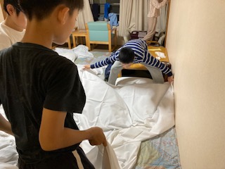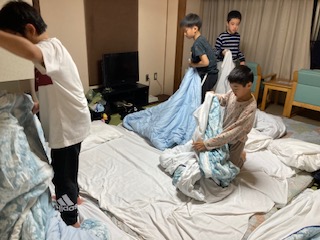 シーツも掛け布団カバー掛けもなかなか難しいようです。みんなで協力すると早くできました。
