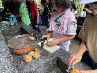 野菜を切り始めました。にんじん、じゃがいもは小さめに切っています。