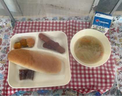 今日は、ウインナーのケチャップソース、スープ、焼きかぼちゃ、コッペパン、いちごジャム、牛乳でした。