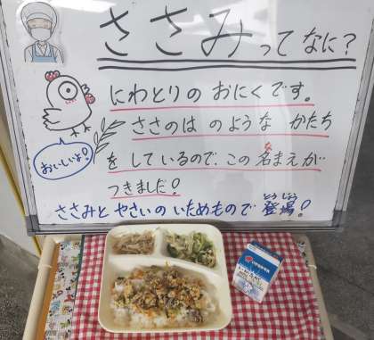 今日は、他人丼、ささみと野菜の炒めもの、もやしの甘酢あえ、牛乳でした。卵アレルギーのある児童も食べられるように卵除去食を用意しました。誤食のないようにピンク色の食器に配膳しています。