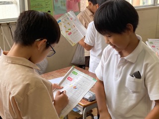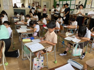 続いて友達のことを紹介するために、何が好きか、色や食べ物の他に自分が考えたカテゴリーについても質問をしました。子ども達は、たくさん相手を見つけて質問をしてノートに書き溜めていきました。「英語をたくさん話せてうれしかった。」「友達にインタビューをして、相手のことをよく知ることができた。」などと振り返りに書いていました。
