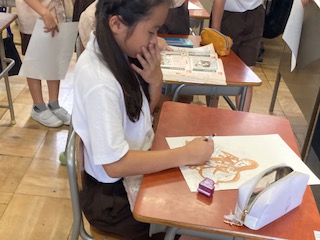 百人一首の中から自分が選んだ作者の姿を描いて、切り絵にします。太くするところ(残すところの線の部分)に色を塗ってわかりやすくしています。