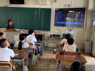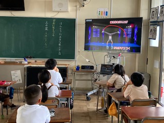 側転の仕方を、NHK for schoolを見ながら確かめています。