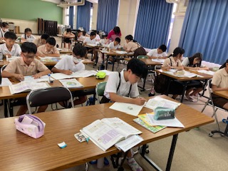 分数のたし算の練習問題を進めました。通分や約分がさっとできるように繰り返し練習もしています。