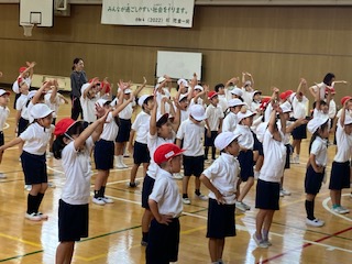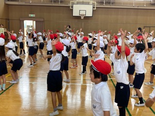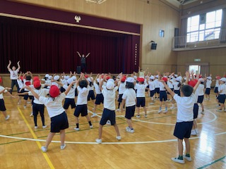 運動会で団体競技の途中にに踊るダンスを練習しました。楽しんで体を動かしています。