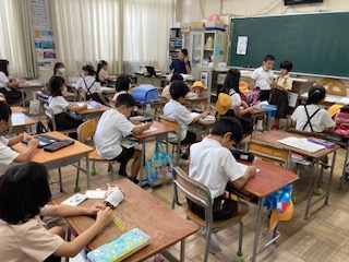8時半になったらそれぞれの学習課題に取り組み、「心の天気」を記入しています。日直さんのスピーチもしっかり聞いています。
