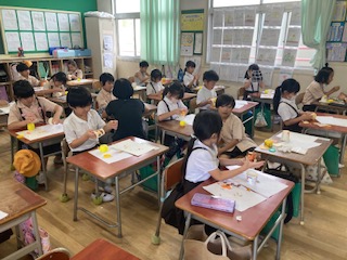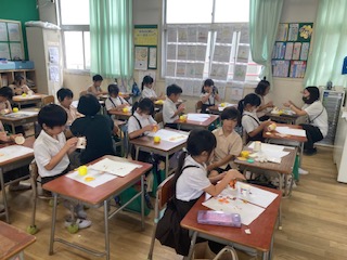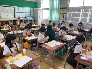 紙コップと色紙を使って、かごを作りました。茶色,黄色,オレンジ、やまぶき色などの色紙を小さくちぎり、自分のイメージに合わせて糊で貼っています。