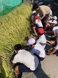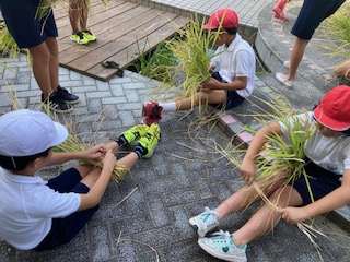 稲刈りをしました。束ねて藁でくくり、はぜ掛けをしました。