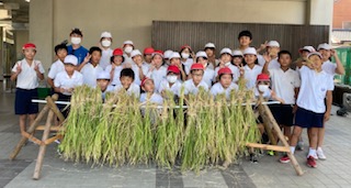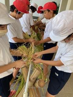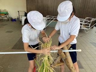 藁で括るのはなかなか難しいです。二人組で協力して行いました。2週間ほど干して脱穀します。