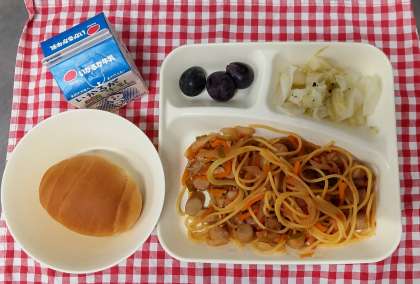 今日は、イタリアンスパゲッティ、キャベツのバジル風味サラダ、ぶどう(巨峰)、ミニ黒糖パン、牛乳でした。