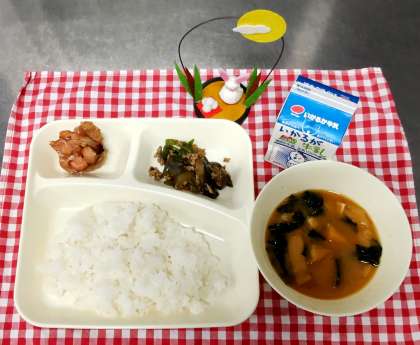 今日は、鶏肉の照り焼き、かぼちゃのみそ汁、なすのそぼろいため、ご飯、牛乳でした。
