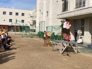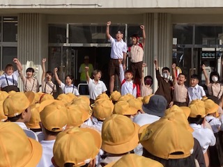全校朝会で、応援団が颯爽と登場しました。初めみんなはどこで声を出して良いか分からなかったのですが、団長のアピールで少しずつ盛り上がっていきました。運動会が楽しみです。
