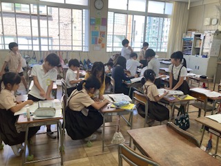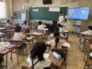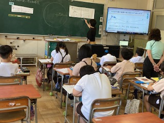 初めてコンパスを使いました。初めはすべったり線が二重になったりして、なかなか上手く描けません。友達と教え合いながら、いろいろな円を描いていきました。