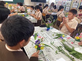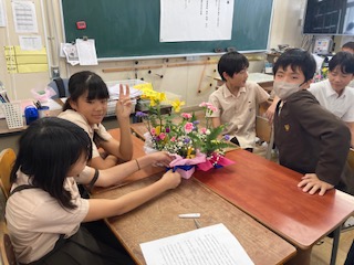 アルストロメリアやスプレーカーネーション,スターチス,かすみそうに加えて、学校で育てた千日紅やタマシダなどを基本をもとに,それぞれ自分の思いを表現しました。