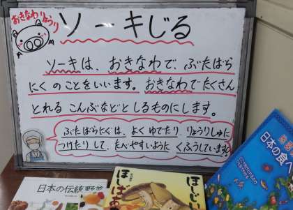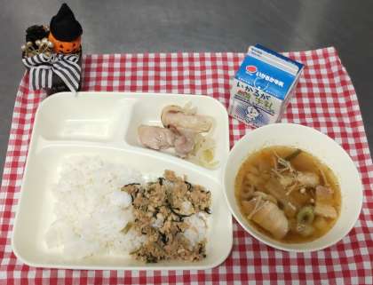 今日は、鶏肉のゆず塩焼き、ソーキ汁、ツナ大豆そぼろ、ご飯、牛乳でした。ソーキは沖縄で豚バラ肉のことをいいます。食べやすいように一度下茹でして下味をつけた豚バラを使って沖縄郷土料理のソーキ汁を作りました。
