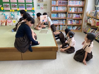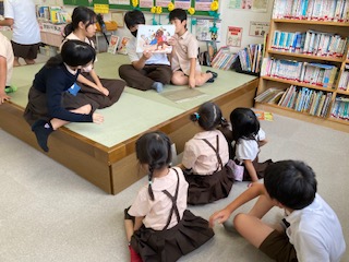 図書委員会児童が、1年生に紙芝居の読み聞かせをしていました。微笑ましい風景です。