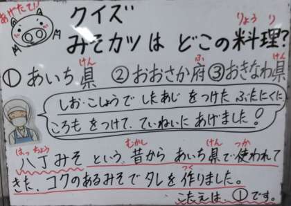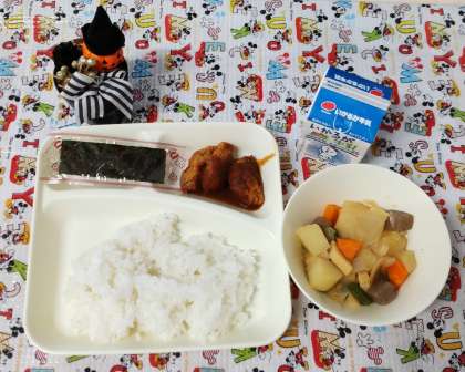 今日はみそカツ、じゃがいもと野菜の煮もの、焼きのり、ご飯、牛乳でした。