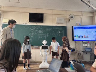 ペッパー君を使ったプログラミングの授業を受けました。一人一人がプログラムを作ってペッパー君に出題してもらったクイズを楽しみました。
