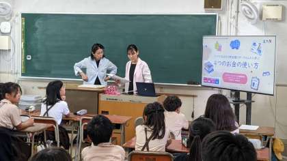 ファイナンシャルプランナーの先生からお金について話を聞きました。お金の歴史や使い方などについてわかりやすく教えていただきました。株式会社など難しい話もありましたが、身のまわりの物の多くが株式会社といわれるところで作っていることも知りました。お小遣いをもらう、使うだけでなく、他にも使い方があり、それによって得することやリスクもあることなども少しわかりました。
