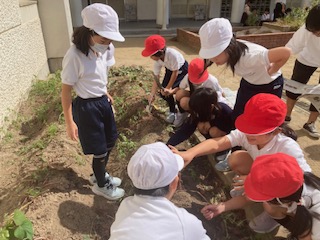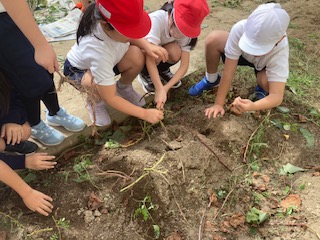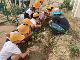 芋掘りをしました。大きいのや、いくつかくっついている芋もありました。たくさんとれて、大歓声があがりました!紅はるかと安納芋ができています。