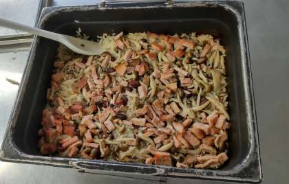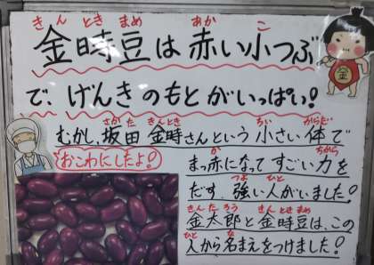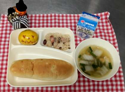 今日は、金時豆の中華おこわ、中華スープ、みかん、おさつぱん、牛乳でした。