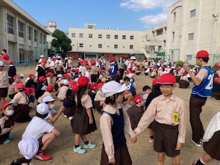 集会委員会による「王様の命令」ゲームをしました。よく聞いていないと間違ってしまいます。1年生は、縦割り班の人の動きも見ながらゲームを楽しみました。