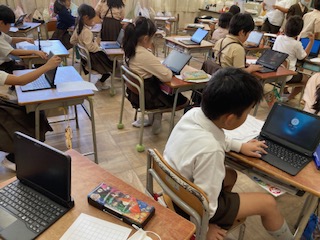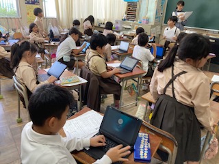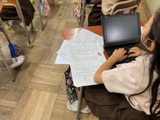 商店街探検でわかっことをパワーポイントにして発表します。メモを見ながらまとめています。