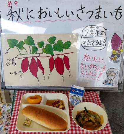 今日は、豚肉といかの中華煮、大学いも、黄桃(缶詰)、コッペパン、バター、牛乳でした。旬のさつまいもは学校で2年生も収穫しました。給食でもたくさん登場します。