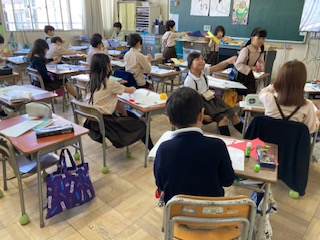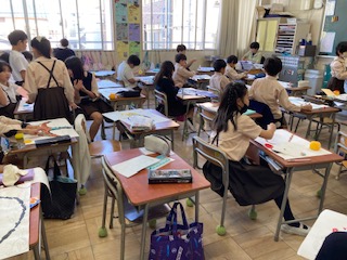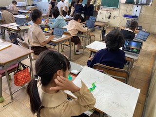 海の生き物をモチーフに、ちぎり絵を描いています。パソコンで調べた生き物を画用紙に描いて、色画用紙をちぎって貼り付けています。