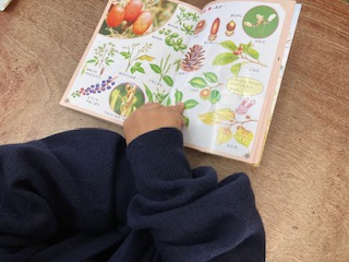 秋の木の実などについて手のひら図鑑で調べました。外に出て、ネコジャラシなど見たり、真夏から変わっている秋の様子を見つけたりしました。
