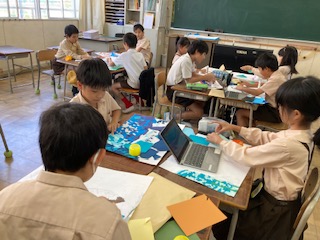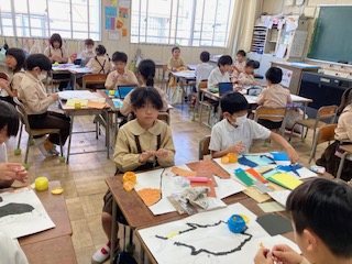 ちぎり絵で海の生き物を表現しています。色のグラデーションなども写真を見ながら工夫しています。