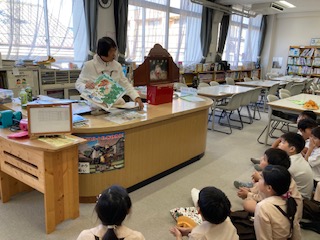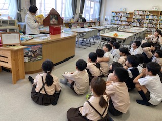 学校司書のM先生に、「てんぐのかくれみの」と「おばけなんてこわくない」の紙芝居を読んでもらいました。