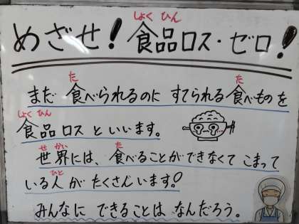 今日から金曜日までの4日間給食委員会の放送で、食品ロスを減らす呼びかけをします。明日からはクイズや委員会児童が考えた食品ロスゼロ川柳の紹介をします。