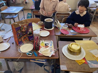 カップ麺の容器などを利用したり、色画用紙を丸めたりして思い思いの帽子を作っています。