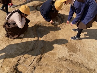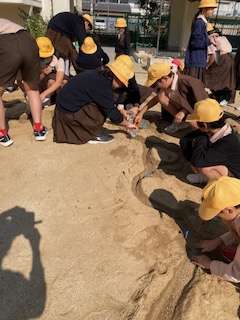 川の水が流れていく様子を模型を使って実験して、様子を観察しました。