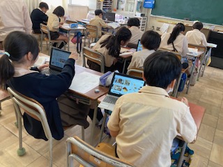 コリントゲームの板に描く絵の下書きをしています。パソコンからキャラクターの絵を探す子もいました。