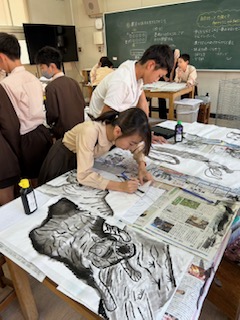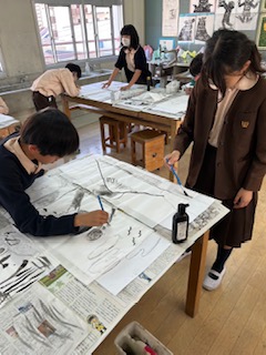 先週下書きをした墨絵に濃淡を加えていきました。徐々に濃淡をつけていくところが難しく、つい塗りすぎてしまう様子も見られました。友達の絵を見て「めっちゃ上手いやん!」と参考にする子どももいました。