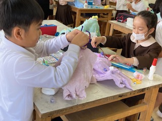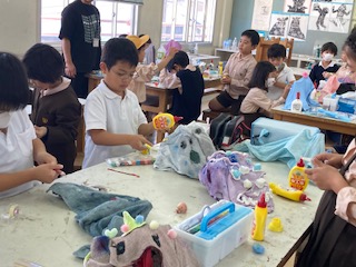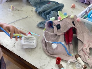 液体粘土で形を作ったタオルに飾りを付けて、かわいらしい、愉快なおばけが出来上がってきました。
