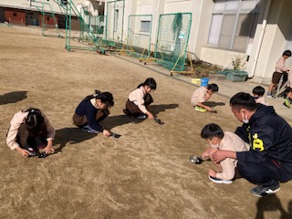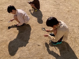 虫眼鏡で太陽の光を集めて、黒い紙を焦がしました。虫眼鏡の向きや角度によって燃え方が違うことに気づきました。