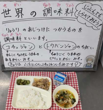 今日は、豚肉のコチュジャンいため、鶏肉とはるさめのスープ、きゅうりのナムル、ご飯、牛乳でした。給食では様々な国の食文化に触れられるように、調味料も工夫しています。今日は韓国朝鮮料理風で組み合わせています。