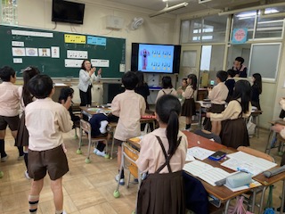 O先生が、2組で音楽の授業をしました。子どもたちは、