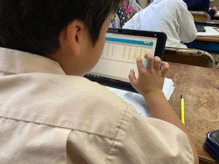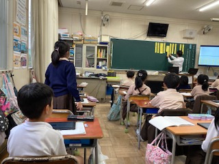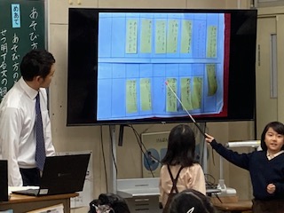 生活科で手作りおもちゃをたくさん作りました。それを1年生に紹介します。遊び方を分かりやすく説明する文章を書くため、どんなメモをどのように並べたら良いか、PCの発表ノートを使ってポイントを確かめた後、自分のメモを同じおもちゃを発表するペアで話し合って修正していきました。