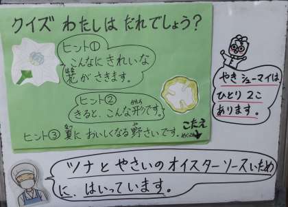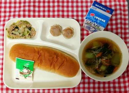 今日は、焼きシューマイ、中華みそスープ、ツナと野菜のオイスターソースいため、コッペパン、マーガリン、牛乳でした。