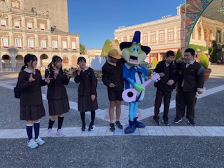 15時から15時半に班ごとに一旦集合して、写真を撮りました。キャラクターとも一緒に撮りました。