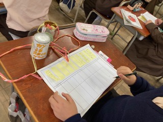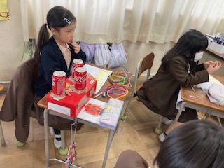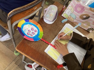 自分が作って1年生に紹介したい遊びの説明文を書くためのメモを付箋に書いています。